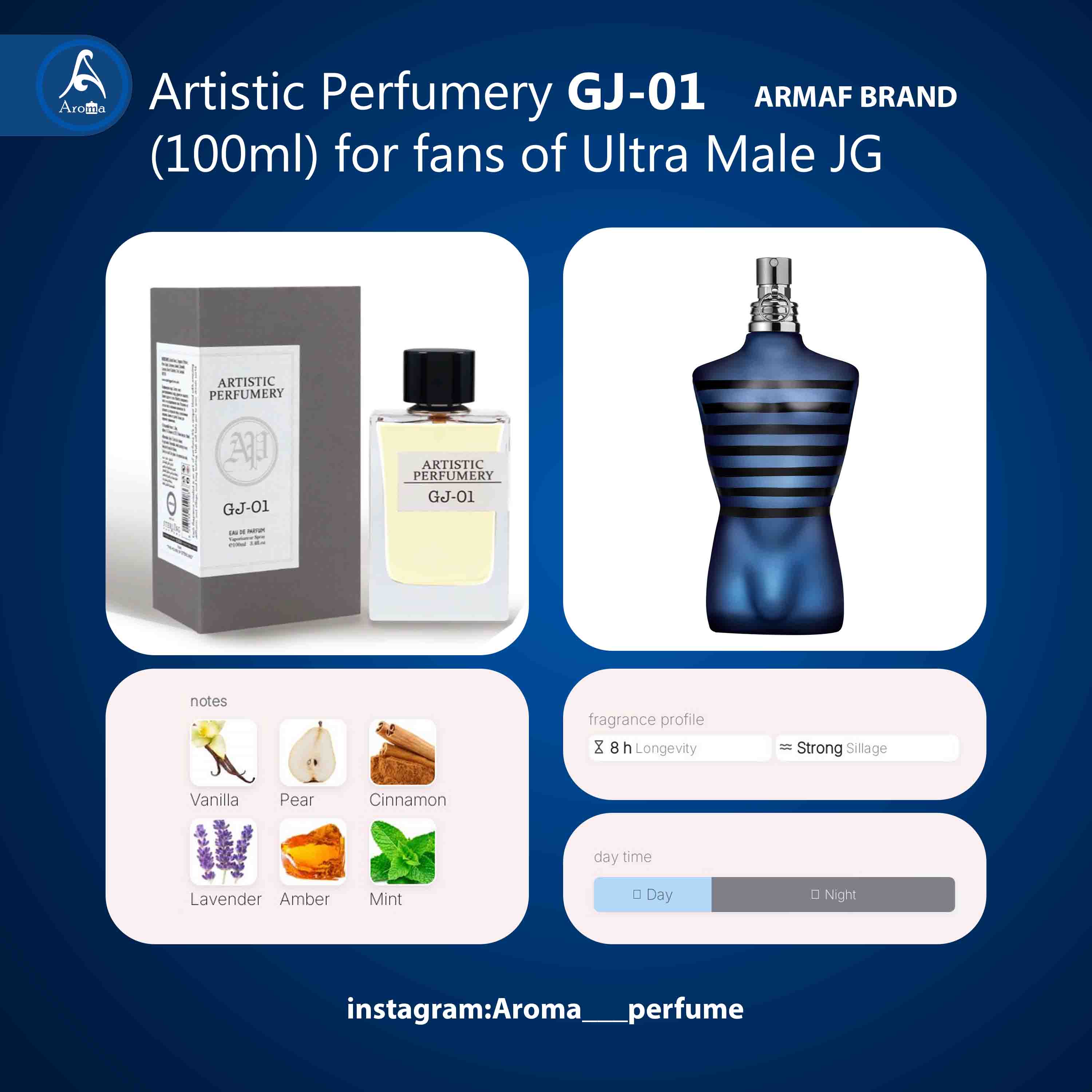 GJ‑01 عطری است پرقدرت و اعتیادآور که روح اغواگر و پرهیجان Ultra Male را با تفسیری هنری و مدرن بازآفرینی میکند.